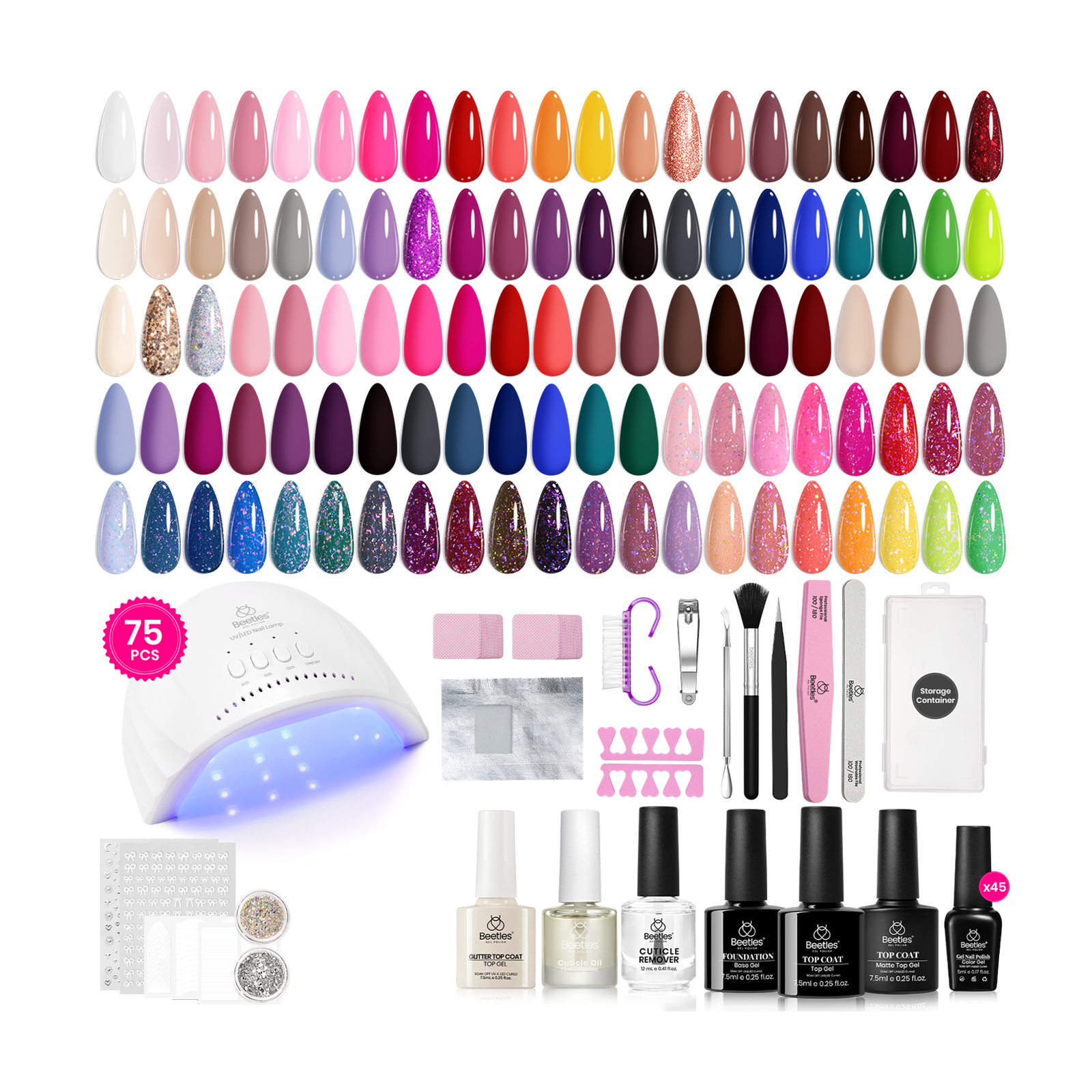 【ALL-IN-1 Gel Nail Kit】: beetles gel nail polish kit includes 45*5ml trendy colors gel polish, 5*7.5ml No Wipe Base and Glossy&Matte&pearlescent glitter Top Coat,24W LED Nail Lamp,7.5ml cuticle oil, 7.5ml instant cuticle remover, 3*False Nail Swatches, 5*nail stickers, 2*nail art
