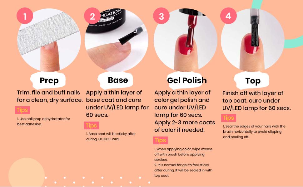 • Cure each layer of base coat, color gel, and top coat for a minimum of 60 seconds under the LED lamp.