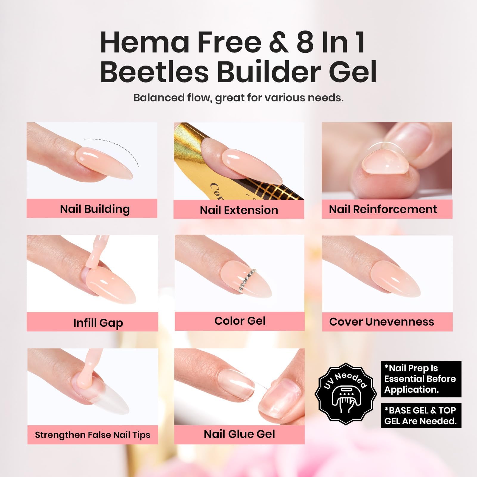 Beetles Building Gel-Perfectly Shaped Nails: Beetles building gel, hard gel nail extension stays in place moves when you need it moved, and has slight self-leveling properties that assist effortless application. It is lighter than acrylic and hard gels, without sacrificing strength and stability but without the monomer odor or excess dust. Brush on, sculpt, and get those nails in tip-top shape with just a few swipes!