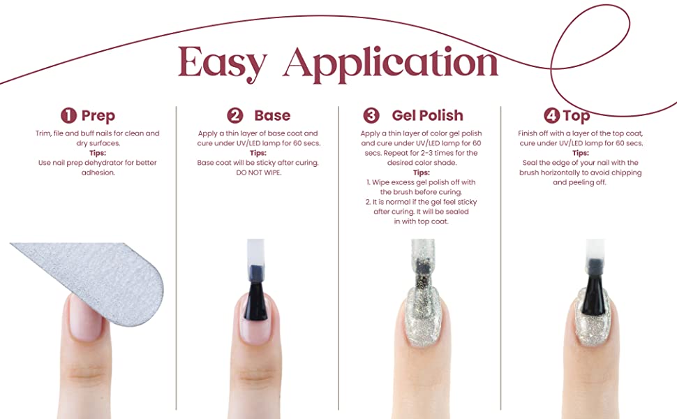 -Cure under lamp for 90-120 secs. Base and Top coat required.If gel feels thick or tacky, place in hot water for 1-2 minutes, remove from water and shake well.