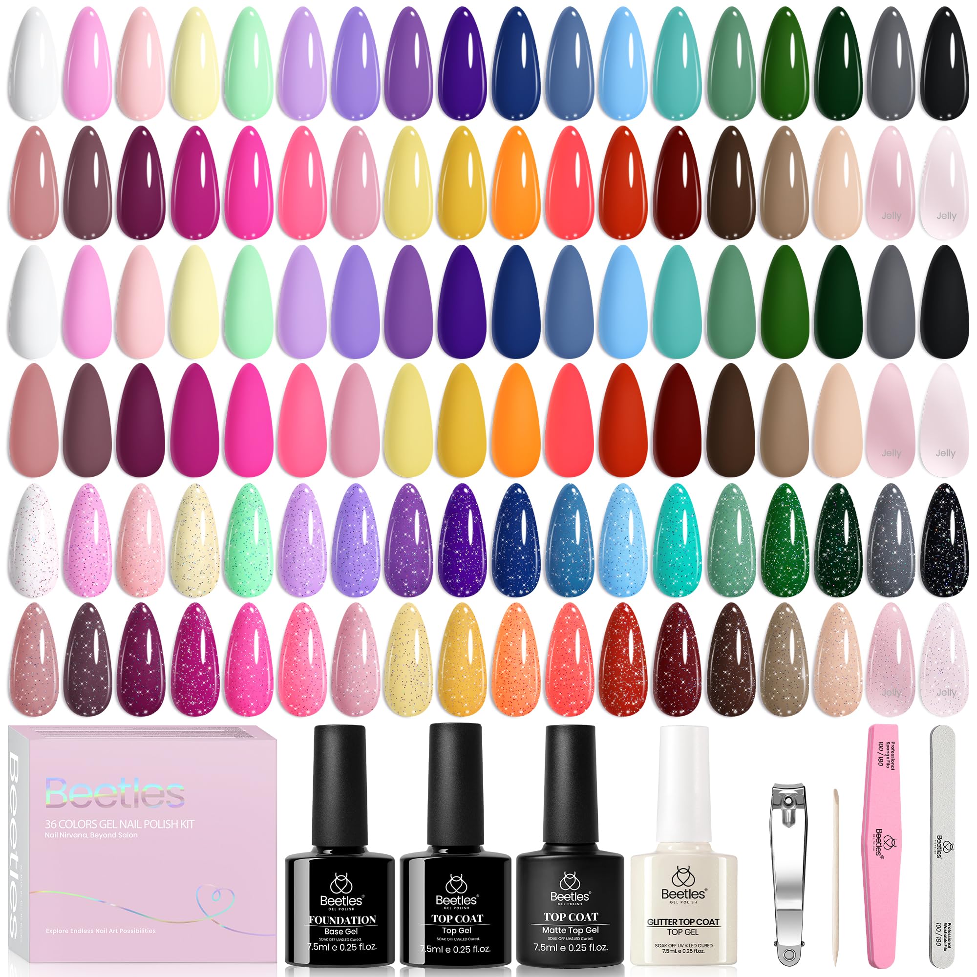 • 36 Colours Gel Nail Kit:These Beetles gel nail polish including 36 classic and fashionable colours gel ( 2 Jelly Gel Polish) , 4 x No Wipe Base and Glossy & Matte & Holographic Glitter Top Coat, 1 x Nail Buffer , 1 x Nail File, 1 x Nail Clipper , 1 x Wooden Stick, these gel polish colours are designed to make a statement and leave a lasting impression.