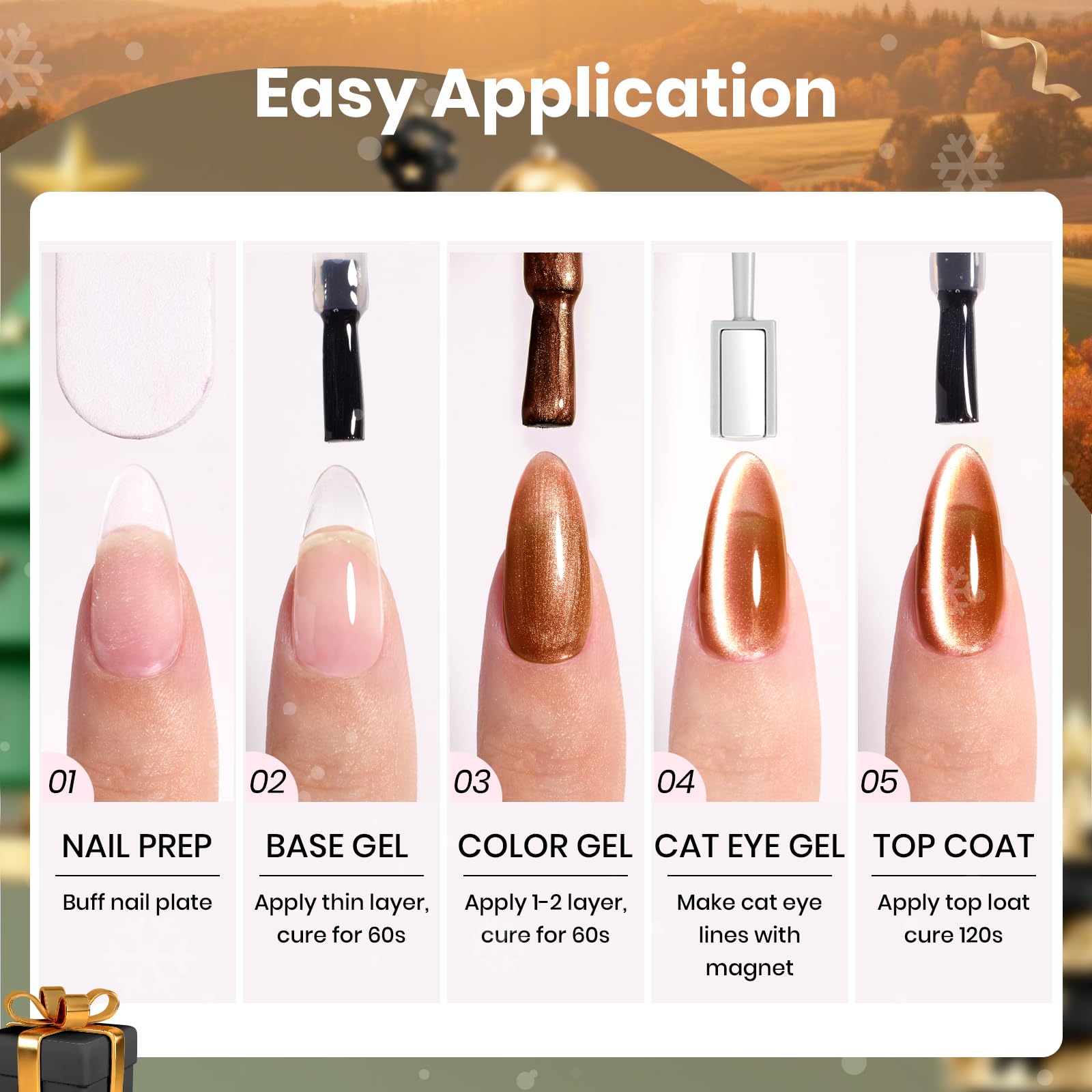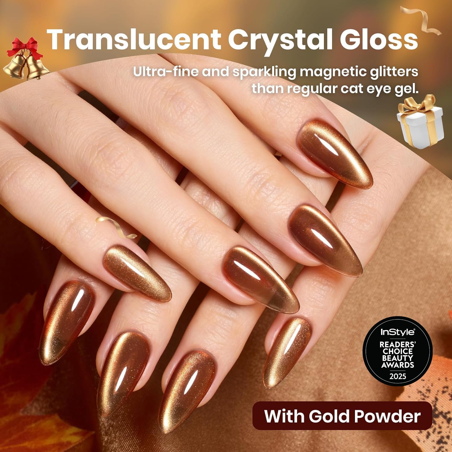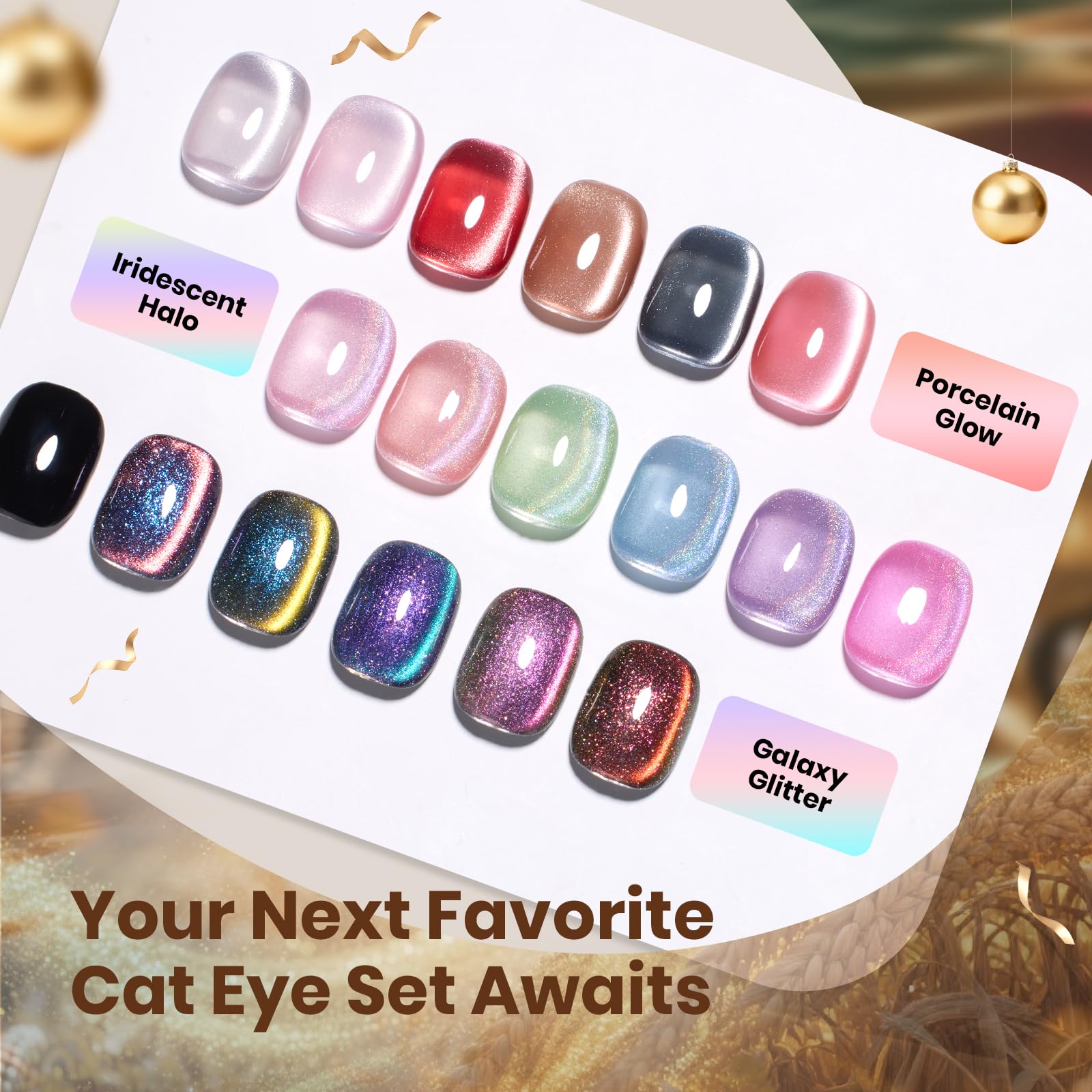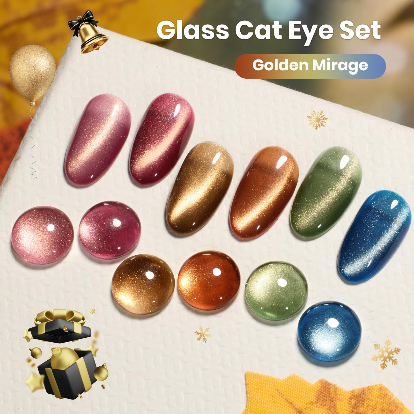 【Golden Mirage Fall Cat Eye Collection】This fall cat eye gel nail polish with gold powder creating a dynamic light play reminiscent of autumn sunbeams dancing through trees or shimmering reflections on a lake. The deep burgundy, warm orange, golden brown, olive green and lake blue color fill your fingertips with the warmth of autumn.This gel cat eye nail polish is equipped with a magnetic tool, uses the magnet to creat different cat eye styles